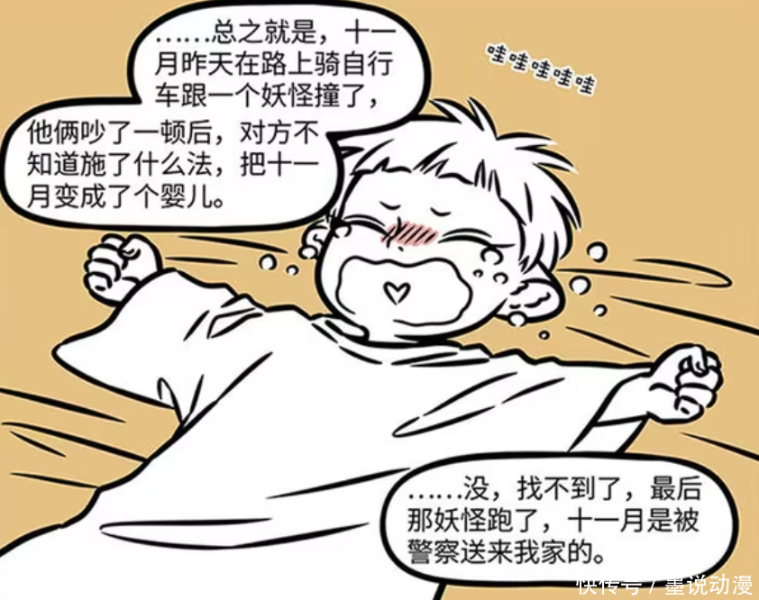 十一月这一次会形成婴儿,便是在路上骑自行车,跟某种妖魔撞在一皆。十一月跟对方吵了一架,没思到对方径直施法,让十一月顿然形成婴儿。那么妖魔径直跑了,调查也找不到他。形成婴儿的十一月,也就这样被送到九月家。