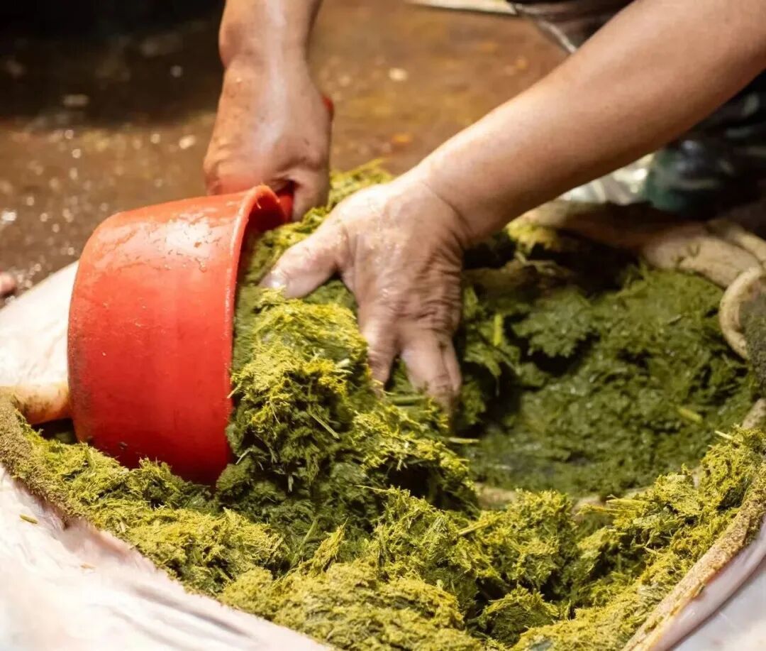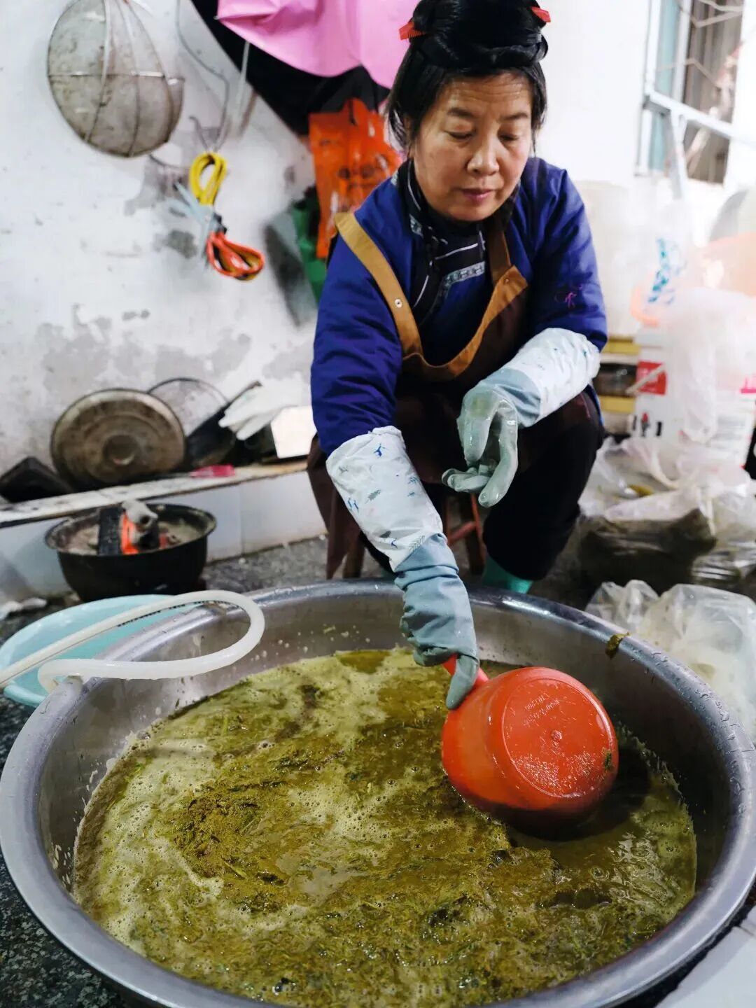 ▲侗族大姐正在将半消化状况的青草加水稀释,过滤出瘪汁