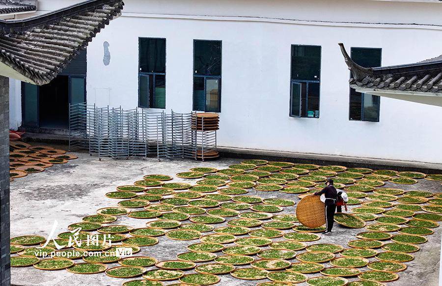 2026年4月10日,在云南省昭通市绥江县会仪镇会仪村,茶农在用摊青筛摊晾茶叶。