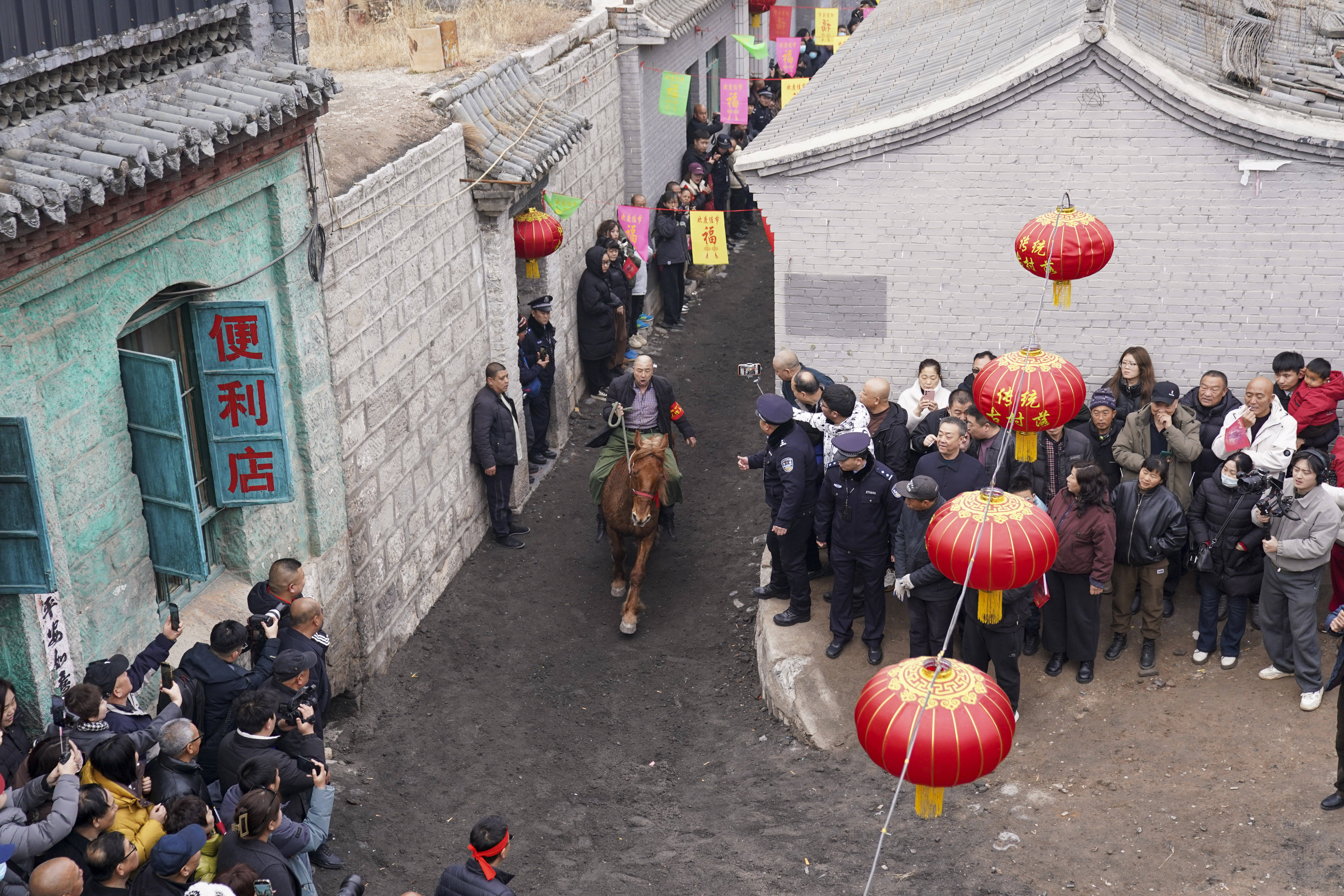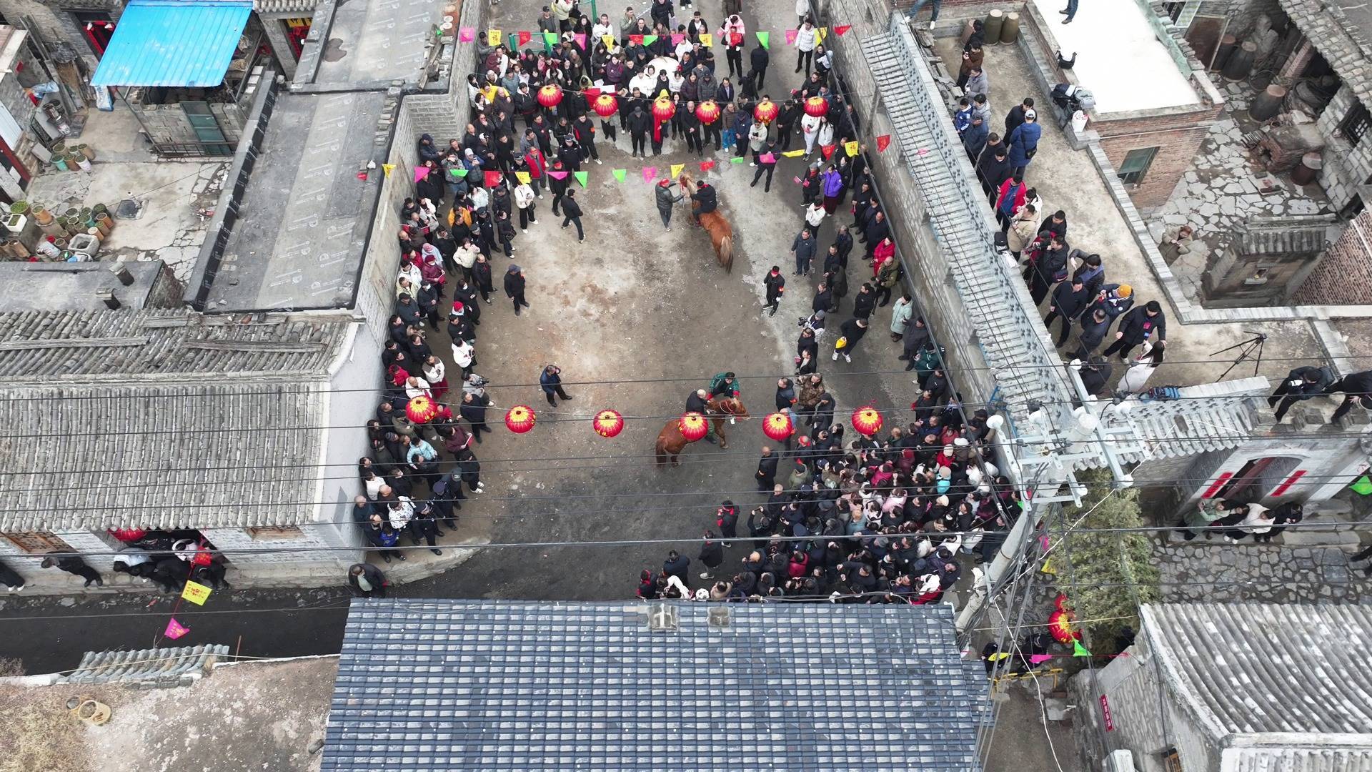 “来了来了!”不知谁喊了一句,刚刚照旧东说念主挤东说念主的胡同,坐窝闪出一条一米多宽的通说念,五匹骏马前后奔出,伴跟着吆喝声、锣饱读声、恭维声,这条胡同瞬时雀跃了起来,赛马排——这项传承千年的春节民俗,也到了最飞扬的时期。