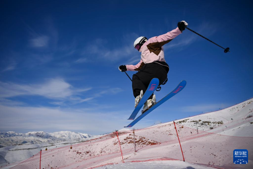 农历除夜当天,雪友在新疆阿勒泰将军山滑雪公园飞越跳台(1月28日摄)。新华社记者 胡虎虎 摄