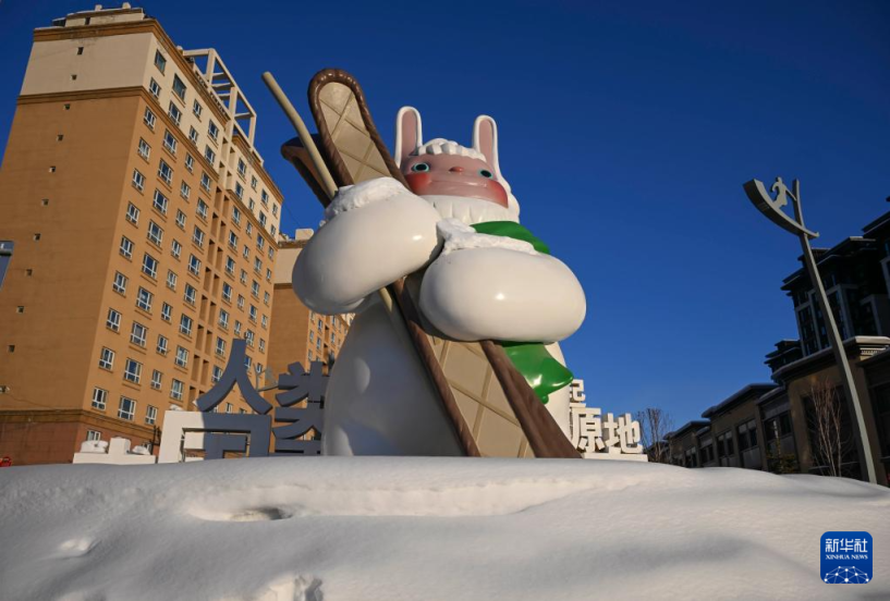“雪怪阿乐”大型文创雕镂摆放在前去将军山海外滑雪度假区的路口(2025年1月24日摄)。新华社记者 胡虎虎 摄