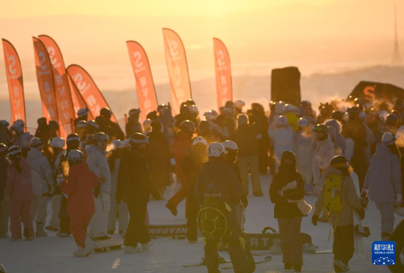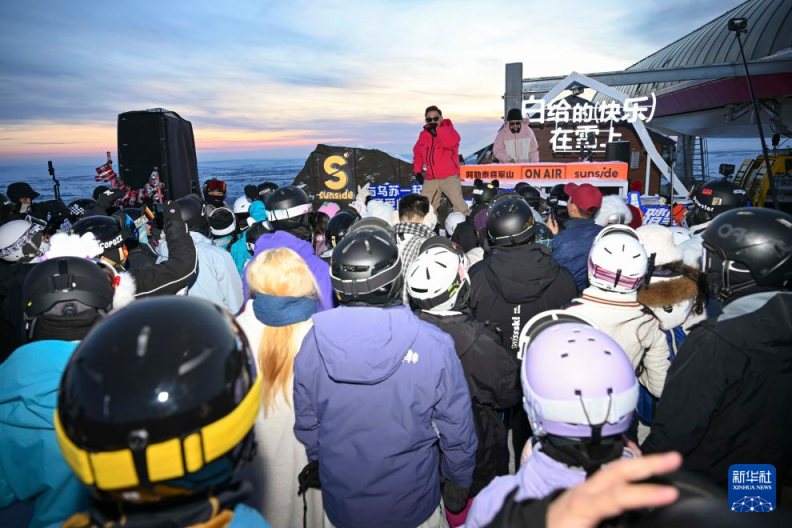 雪友在新疆阿勒泰将军山海外滑雪度假区进入“夕阳派对”(2025年1月28日摄)。新华社记者 胡虎虎 摄