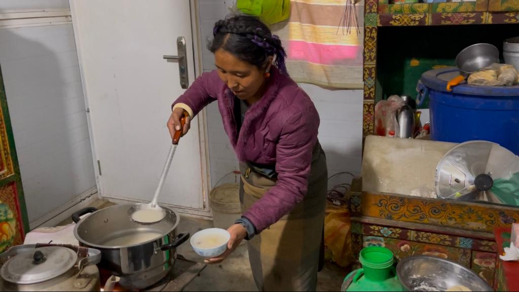 2月27日,阿旺次仁的老婆拉巴普尺正在盛“古突”。新华社记者 蒋梦辰 摄