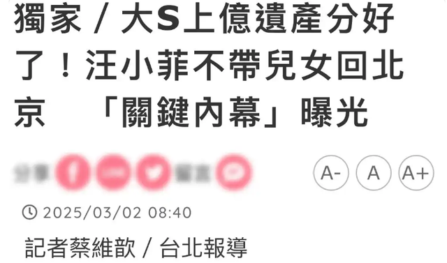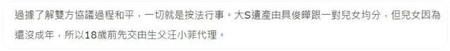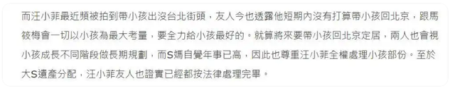 在3月2日,台媒爆料,大S的遗产以及两个孩子的监护权问题皆也曾处理已毕,字据法律法规,大的遗产归具俊晔以及汪希玥汪希箖所有。