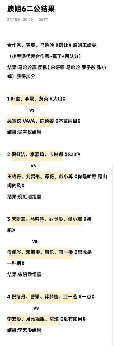 再望望这赛制,二公赛制分为两轮,双东说念主合作舞台和团队抵挡赛。在双东说念主合作舞台要领,由一公小考成绩前两名的军队各派又名成员出战,争夺“乘风值”加成。叶童团队派出黄英,宋妍霏团队派出马吟吟,两东说念主合作饰演《谦让》。这就像是一场能手过招,最终马吟吟胜出,为团队获得20分加成。团队抵挡赛则是8组两两PK,总分前两名全员安全,末尾两组淘汰成员。最终宋妍霏组以700分(《舞娘》)夺冠,倪虹洁组653分(《salt》)位列第二,吴宣仪组635分(《本草撮要》)险胜叶童组(611分《大山》),而祝绪丹组(579分)和王珞丹组(592分)垫底,蒋梦婕、刘禹彤缺憾离场。