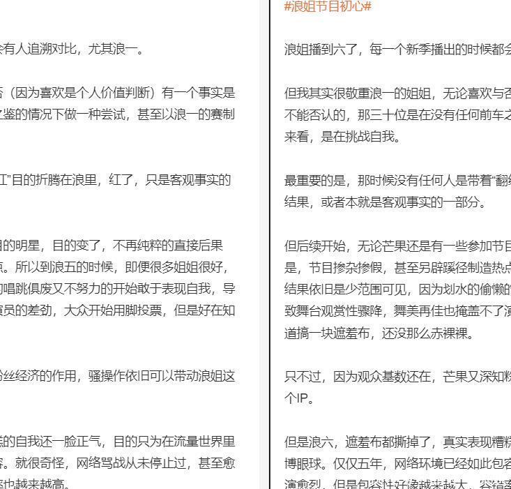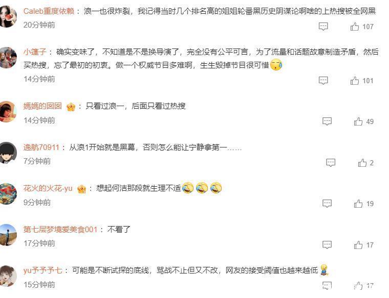而况不雅众以为浪姐这档节目变味了,一驱动是冲破年齿照顾,让姐姐们展示不老的情感和风范,公共走红是顺其当然的,吃红利也应该。然则当今节目阑珊热度和立异,姐姐们的东谈主气和话题点不燃,于是节目组又驱动通过疑似脚本和编著加上多样运作,制造吵架、矛盾不对炒作,以致还出现劣胜优汰疑似刻意污蔑比赛效果的黑幕炒作,让网友们吐槽质疑。