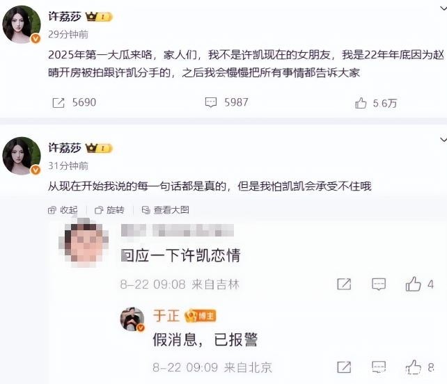 许凯方面默示这些爆料均为谎话,并已报警处理,同期承认与许荔莎、大金确有过往。