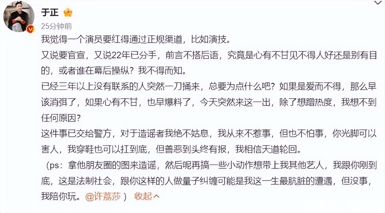 其牙东说念主于正也发声力挺,质问许荔莎炒作求红。