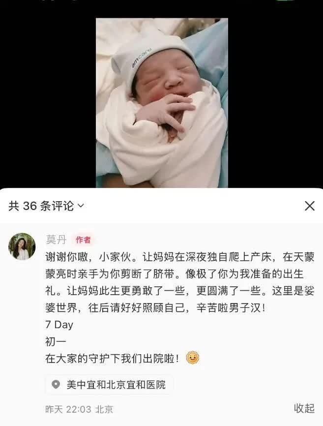 据莫丹知道,小女儿于夜深发动,她独自爬上产床,在天蒙蒙亮时亲手为孩子剪断了脐带。"谢谢你嗷,小家伙。让姆妈在夜深独自爬上产床,在天蒙蒙亮时亲手为你剪断了脐带。像极了你为我准备的出身礼。让姆妈此生更勇敢了一些,更圆满了一些。往后请好好护理我方,艰苦啦男人汉!" 这段饱含深情的翰墨,说念出了一位母亲坐褥经过中的繁难与幸福。