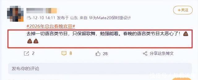 最严重的是居然有部分东谈主对通盘的讲话类节目示意含糊。 三冷落去除讲话类节目 那时,在央视官宣春晚没多久后,就有东谈主粗犷的跳出来,示意应该去掉通盘的讲话类节目,比如小品,诗歌什么的,就留歌舞就行了。 他以至还示意讲话类节目“恶心”,看不下去。
