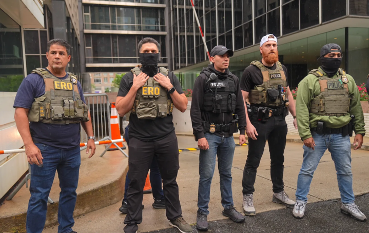 唯有刷到过一些对于ICE的视频,你一定会难忘他们简直一模一样的着装:军绿色的全套迷彩服、印着ERO或者ICE的防弹背心,大部分东说念主还会戴着口罩、墨镜、面罩或者巴拉克拉法帽这类配饰来粉饰面部。