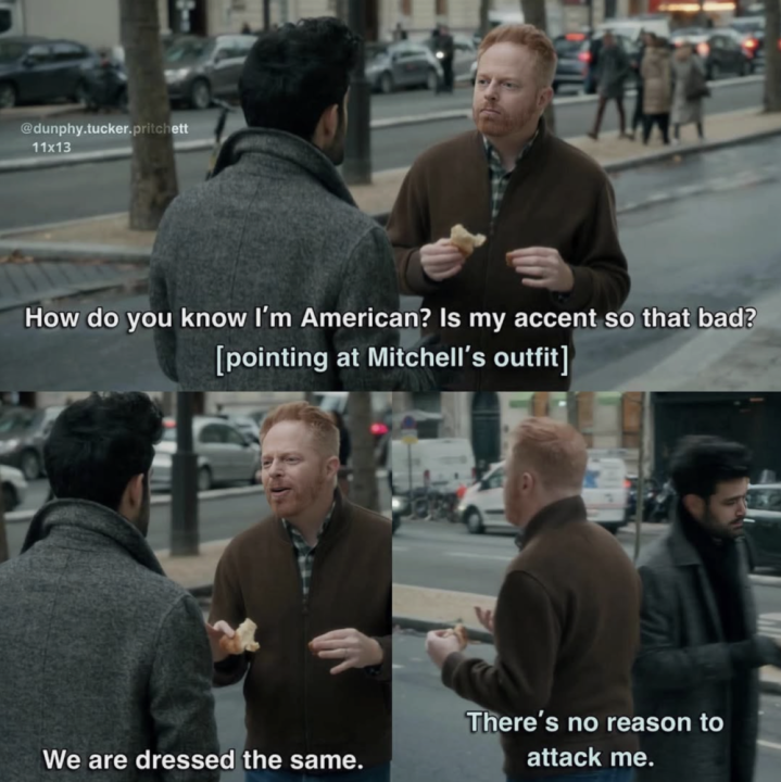 在《摩登家庭》里就有这样一幕。米奇一句“咱俩穿得都一样”径直把法国路东说念主搞破防:你莫得根由膺惩我。