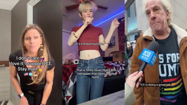 反ICE的在叱咤暴力,ICE说这是上头的命令,守旧ICE的一边舞蹈一边说Idon'tcare。