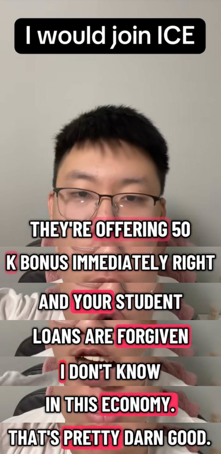 一位亚裔学生说了丹心话:讲真老兄,我不知说念。在这个经济环境下,我是真想加入ICE