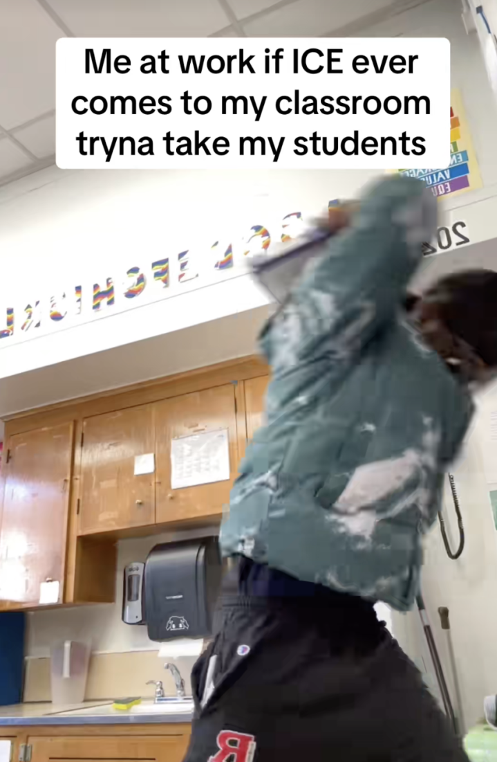 “如果ICE来握我的学生,我就这样理睬他们(一套强烈的拳法)。”