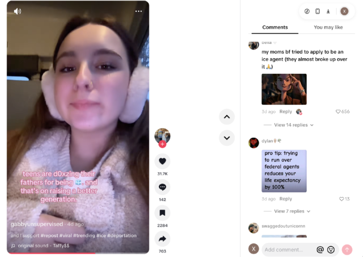一些Z世代或者更年青的东说念主们也在网上命令同龄东说念主d0xzing(蚁集词,即东说念主肉搜索)我方在ICE的爸爸们,并把他们的东说念主脸、姓氏和具体信息po到网上。
