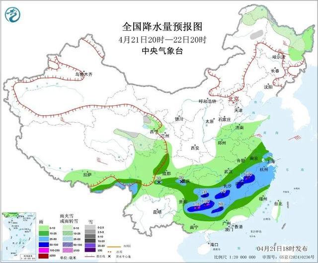 内蒙古东北部、黑龙江北部、青海中部等地部分地区有小雪或雨夹雪。西藏东南部、四川中部、重庆南部、云南西北部、贵州中东部、江南大部、华南北部、江淮南部等地部分地区有中到大雨,其中,湖南中部、江西北部、浙江西部、广西北部、广东西北部等地部分地区有暴雨,局地大暴雨(100~140毫米)。黑龙江中东部、西藏北部和东部等地部分地区有4~6级风;渤海、东海东北部海域有6~7级风、阵风8级,黄海南部、东海西北部和南部、台湾海峡等海域有5~6级风、阵风7级。