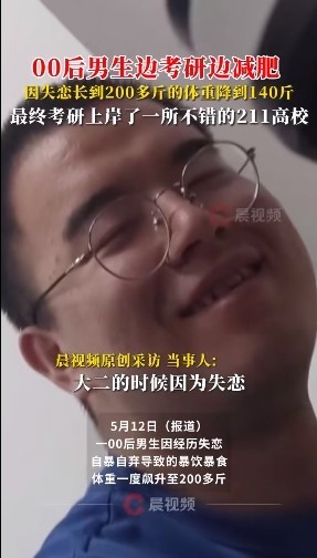 近日,江苏无锡,00后男生一边考研一边减肥,半年瘦了70斤并奏效上岸双一流高校。当事东谈主呼同学暗意我方大二的时候因经验失恋故步自命,暴饮暴食导致体重一度飙升至200多斤,为了开脱颓落的现象,男生启动了考研与隆重的双重洽商,刻下不仅体重降到了140斤,也奏效上岸一所可以的高校。