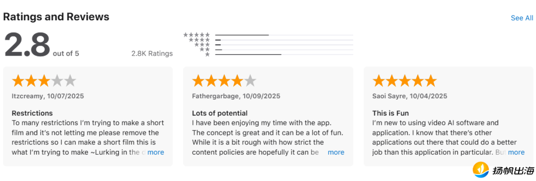 用户给出差评,“第三方违法”成发展远离?Sora上线近10天,目下在App Store上已获取两千余条评价,轮廓评分仅为2.8分。