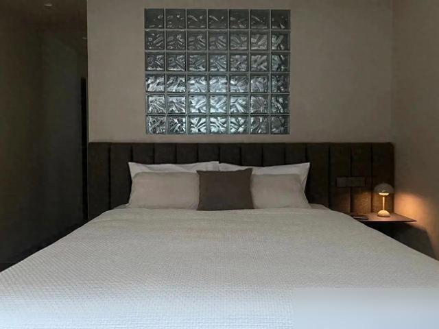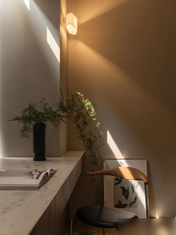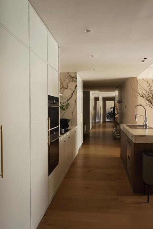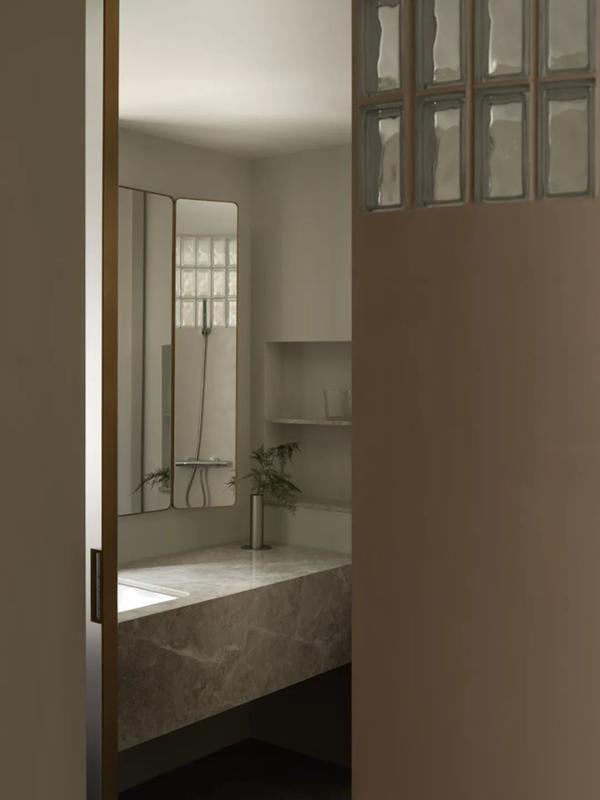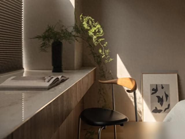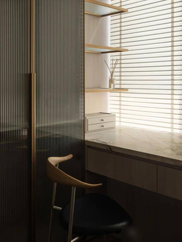 岩板台面切割得犹如拼图般淡雅,微水泥墙面营造出光影幻化的成果,以致电视墙皆玄机地遮盖在电动门后——这并非炫富,而是对生涯细节的握着追求。