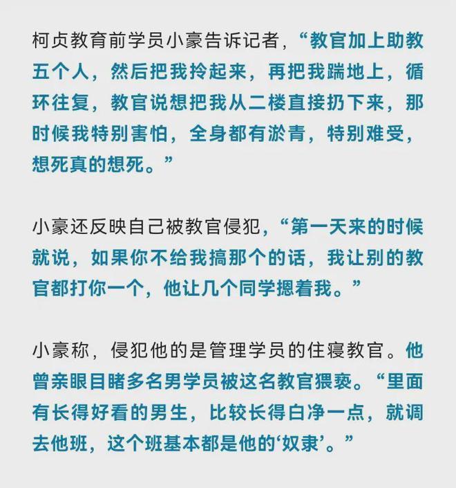 本年八月初,别称学员离校后主动报警,家长们才知说念发生了什么。现在,这家名为“柯贞”的特训学校已被关停,涉事教官因强制猥亵被警方收尾案件,正在警方的侦办中。