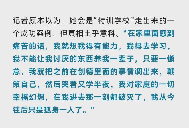 记者在采访的尾声,意志了一个女孩,她离开“特训学校”之后重返高中课堂,并通过我方的勤苦考上了一所“985”高校。
