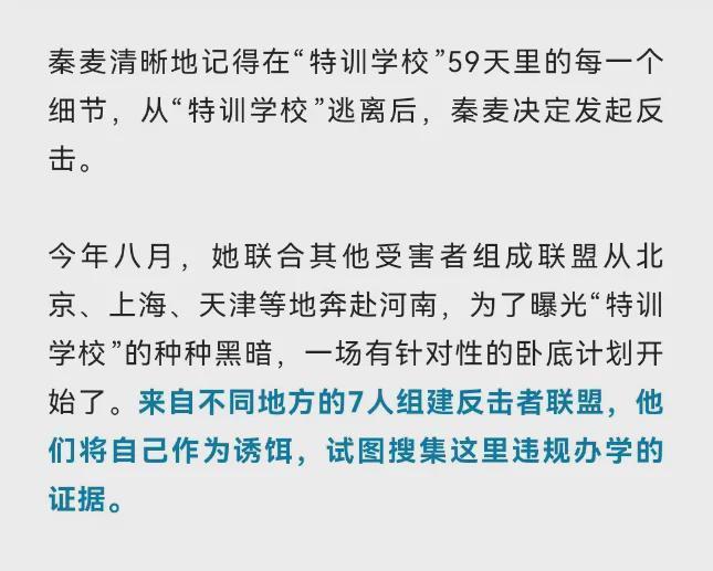 这场对特训学校的反击举止被称为“反击者定约”,参与者一共有7东说念主,最小的唯独16岁,他们从北京、上海、天津聚会到沿途,试图征集特训学校违法办学的笔据。